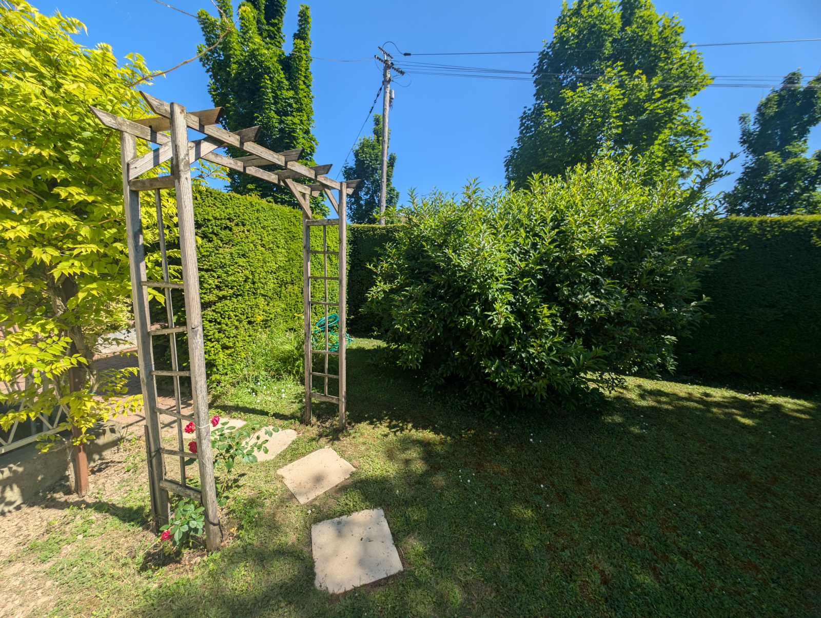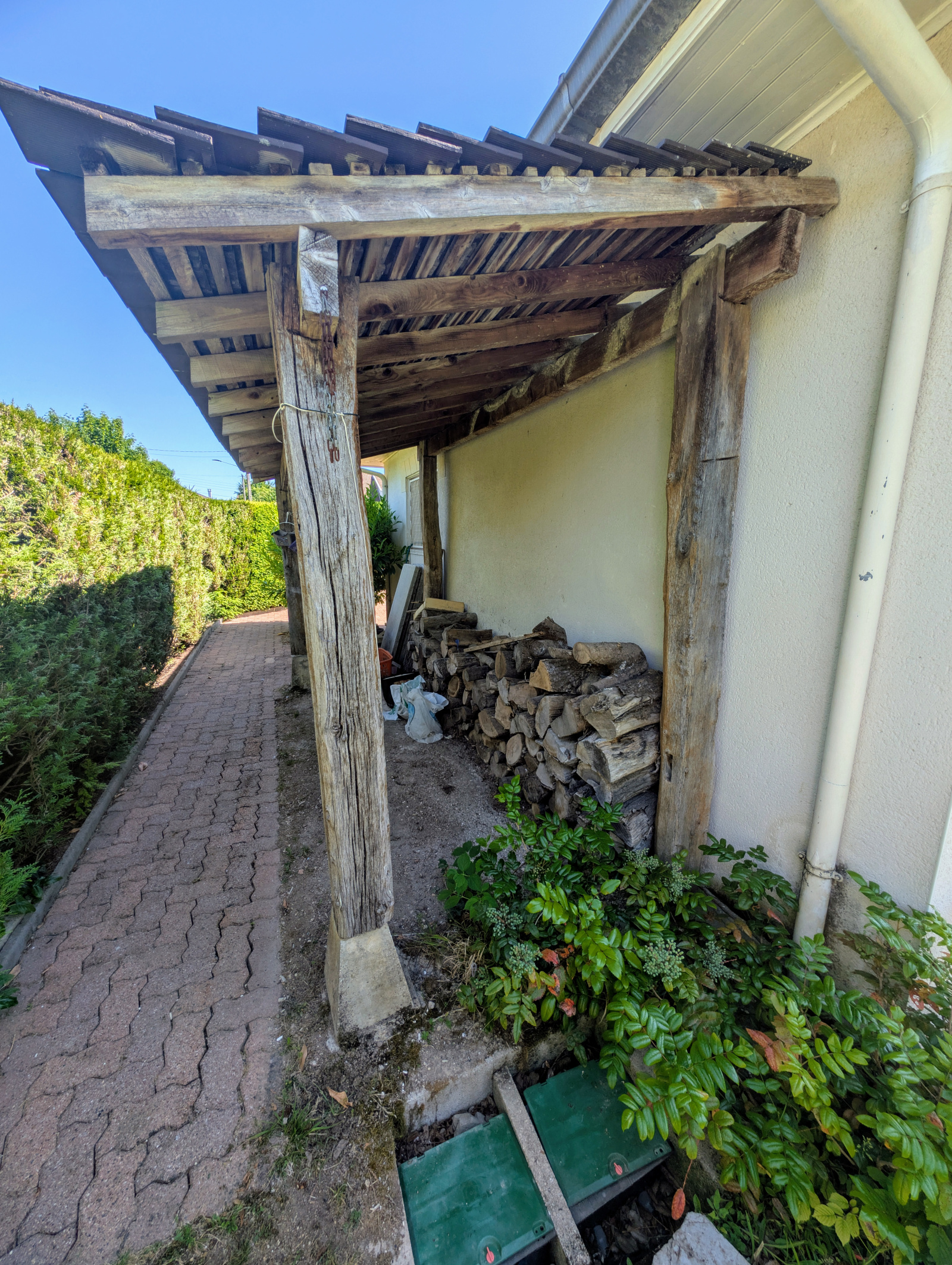 Dès l’entrée, un portail s’ouvre sur une belle parcelle arborée avec plusieurs arbres fruitiers. Le terrain dispose également d’un grand garage de 20 m², d’un cabanon de jardin en dur pour le rangement extérieur, d’un bûcher et d’un espace encore constructible représentant près de la moitié de la surface totale, idéal pour un projet d’agrandissement ou une construction annexe.