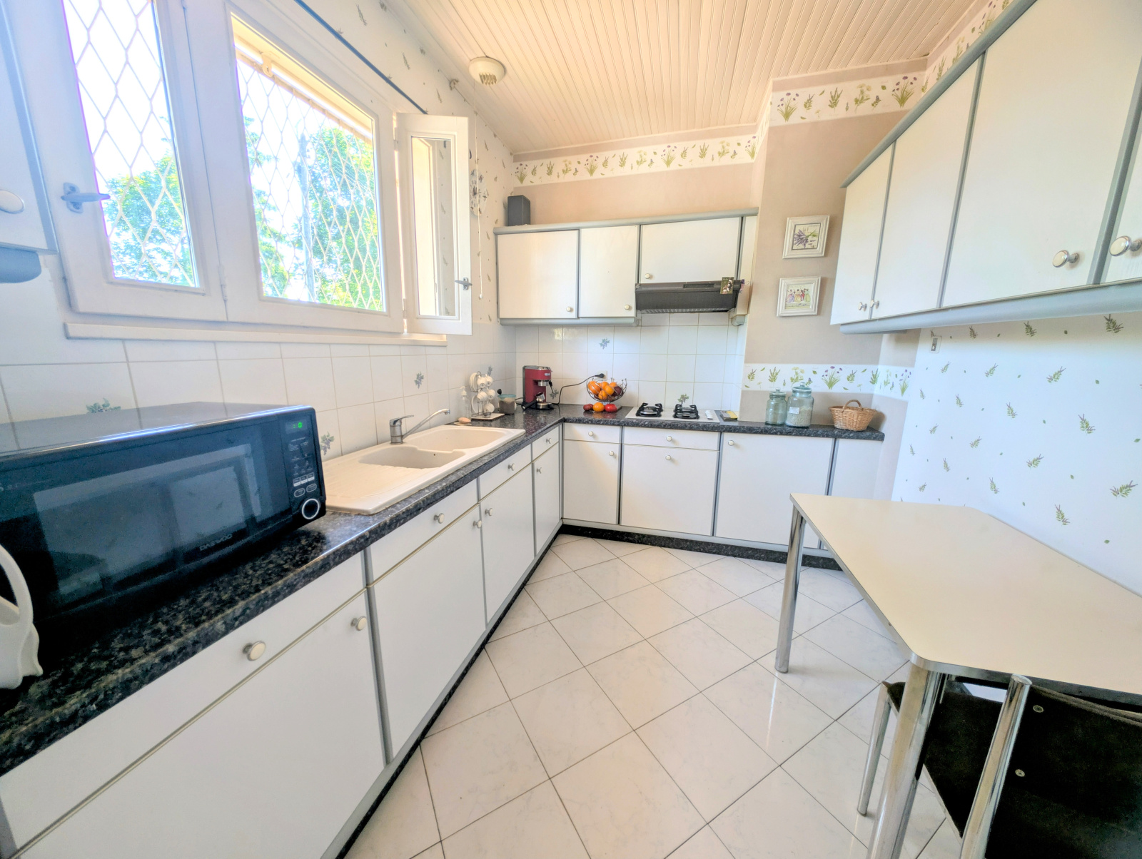 La maison se compose d’un double salon spacieux de 45 m² avec cheminée bois, d’un coin séjour convivial, d’une cuisine séparée, aménagée et équipée, de trois chambres et d’un bureau, avec la possibilité d’aménager une quatrième chambre selon les besoins. La salle de bains est équipée à la fois d’une baignoire et d’une douche. WC indépendant.
