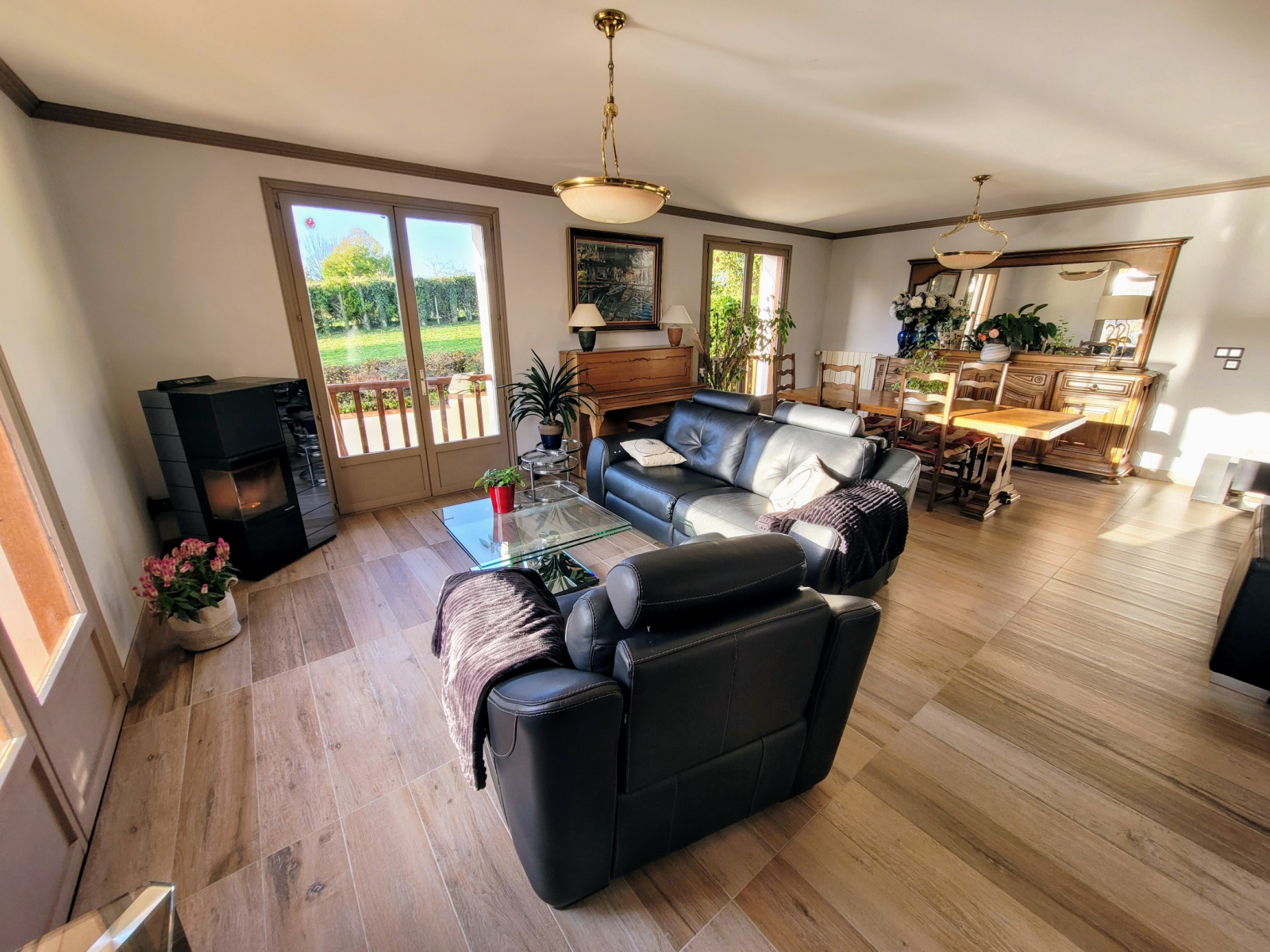 Elle est composée d’une vaste entrée, un grand séjour d’environ 46 m² avec son ambiance cheminée et poêle à pellet, un accès à une grande terrasse de 66 m², une belle et confortable cuisine indépendante équipée et aménagée, deux grandes chambres avec rangements, WC indépendants, salle de bains et un accès direct au sous-sol.
