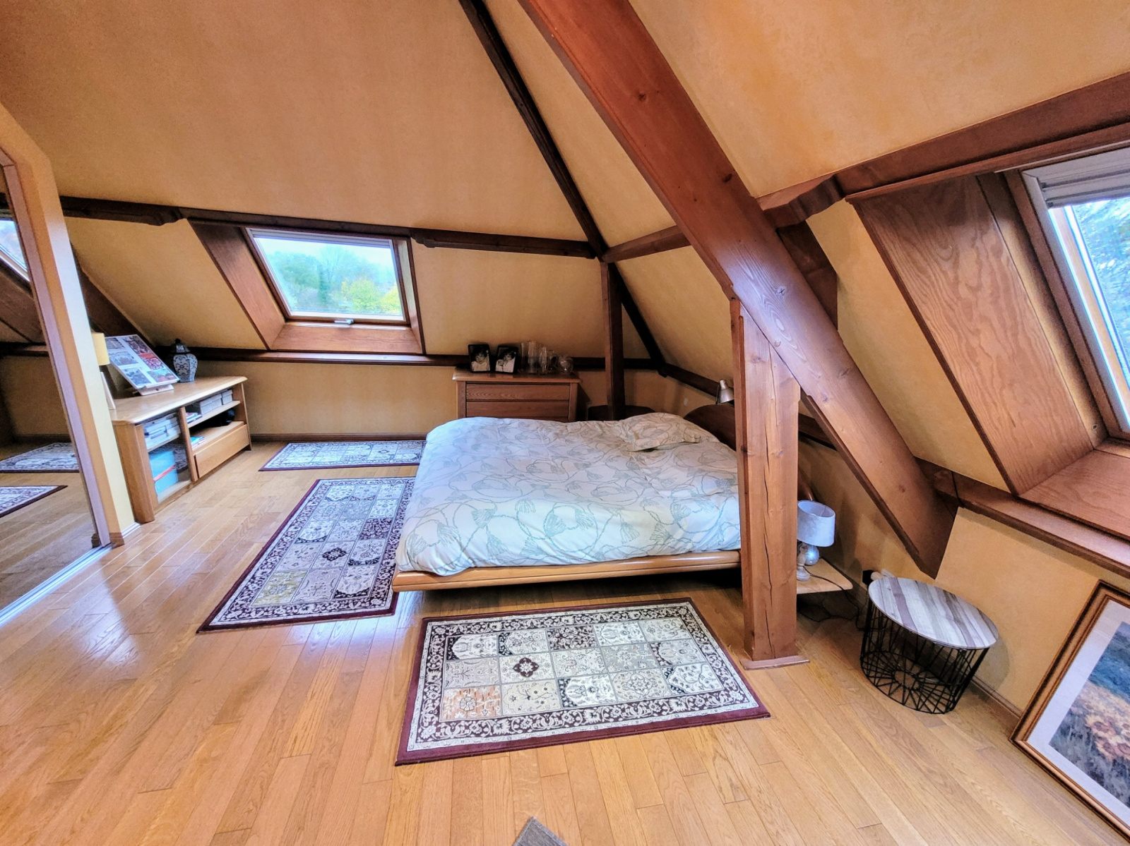 Un élégant escalier nous mène à un palier, deux grandes chambres, une salle de douches et wc.