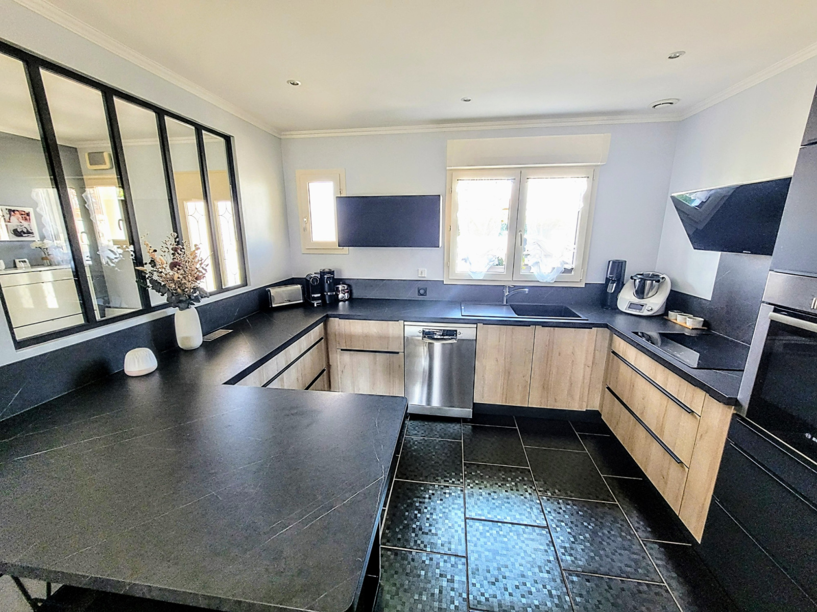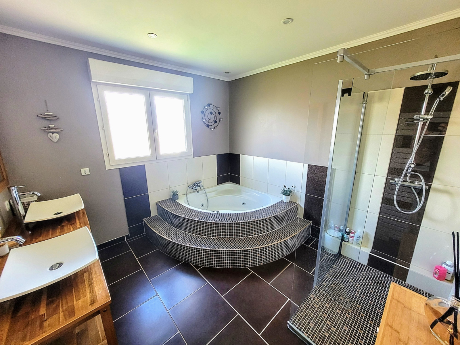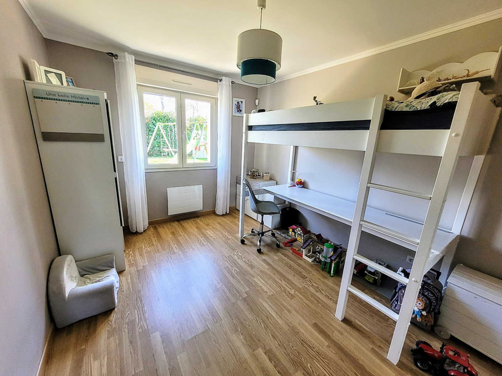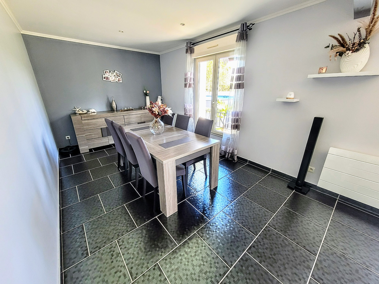 Cette maison dispose de 3 chambres spacieuses avec dressing offrant de nombreux rangements parfaits pour une famille. La vaste salle de bain est équipée d'une baignoire d'angle, d'une douche à l'italienne ainsi que de deux vasques, idéale pour se détendre après une longue journée de travail. Elle offre également un double salon/séjour d'environ 45 m² ainsi qu'une cuisine semi-ouverte équipée récente avec verrière. La maison est très lumineuse grâce à ses grandes baies vitrées donnant sur un jardin verdoyant avec une piscine hors-sol. Vous bénéficierez également d'un garage pour un espace de stockage en supplément.