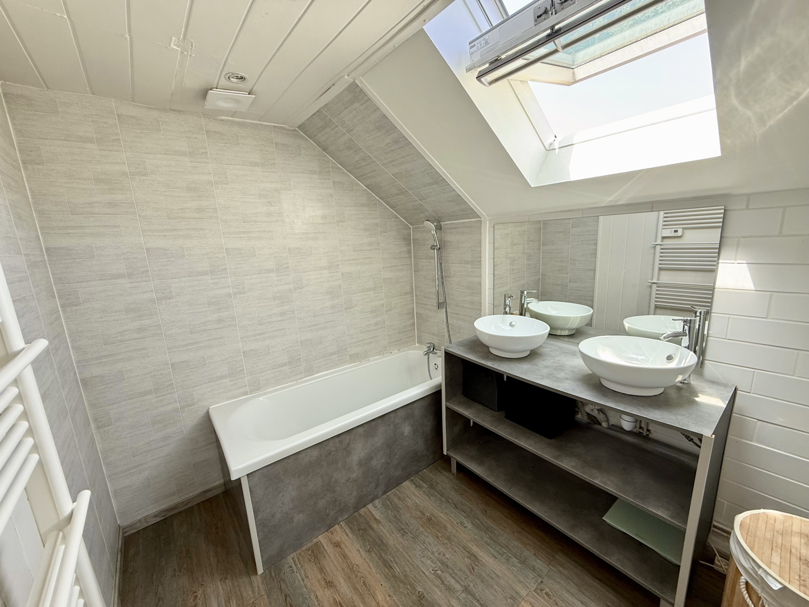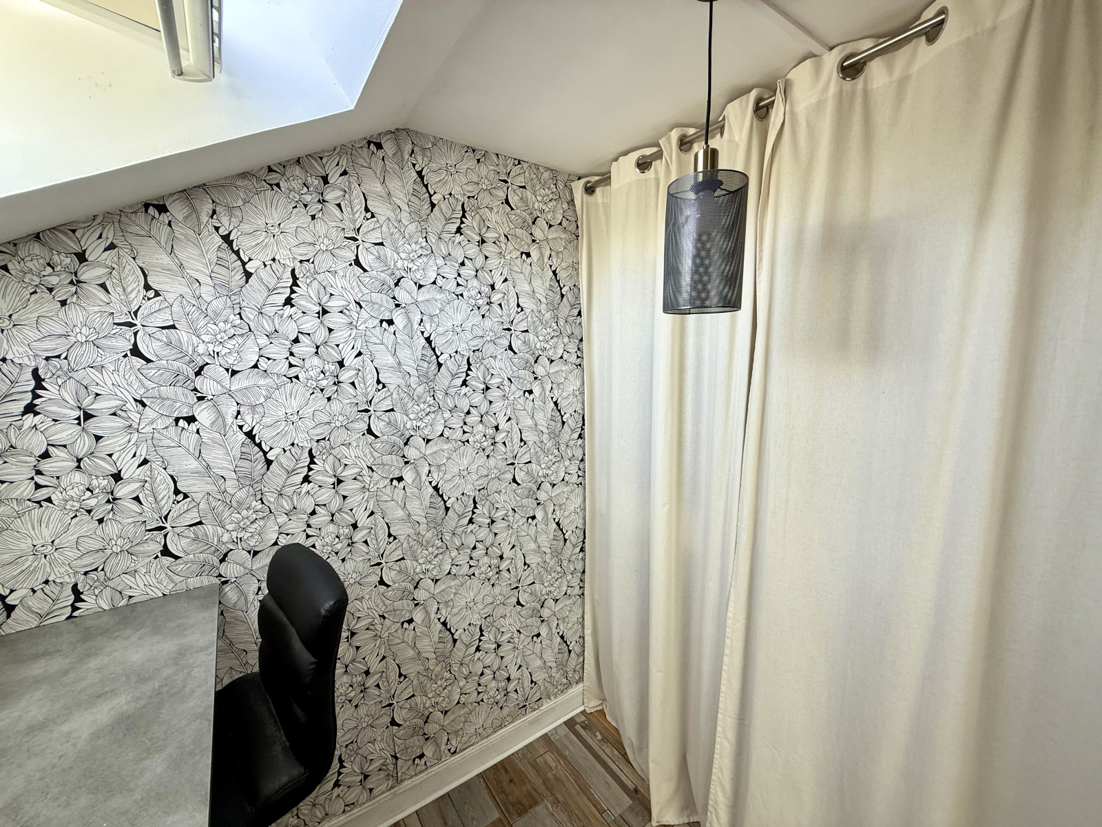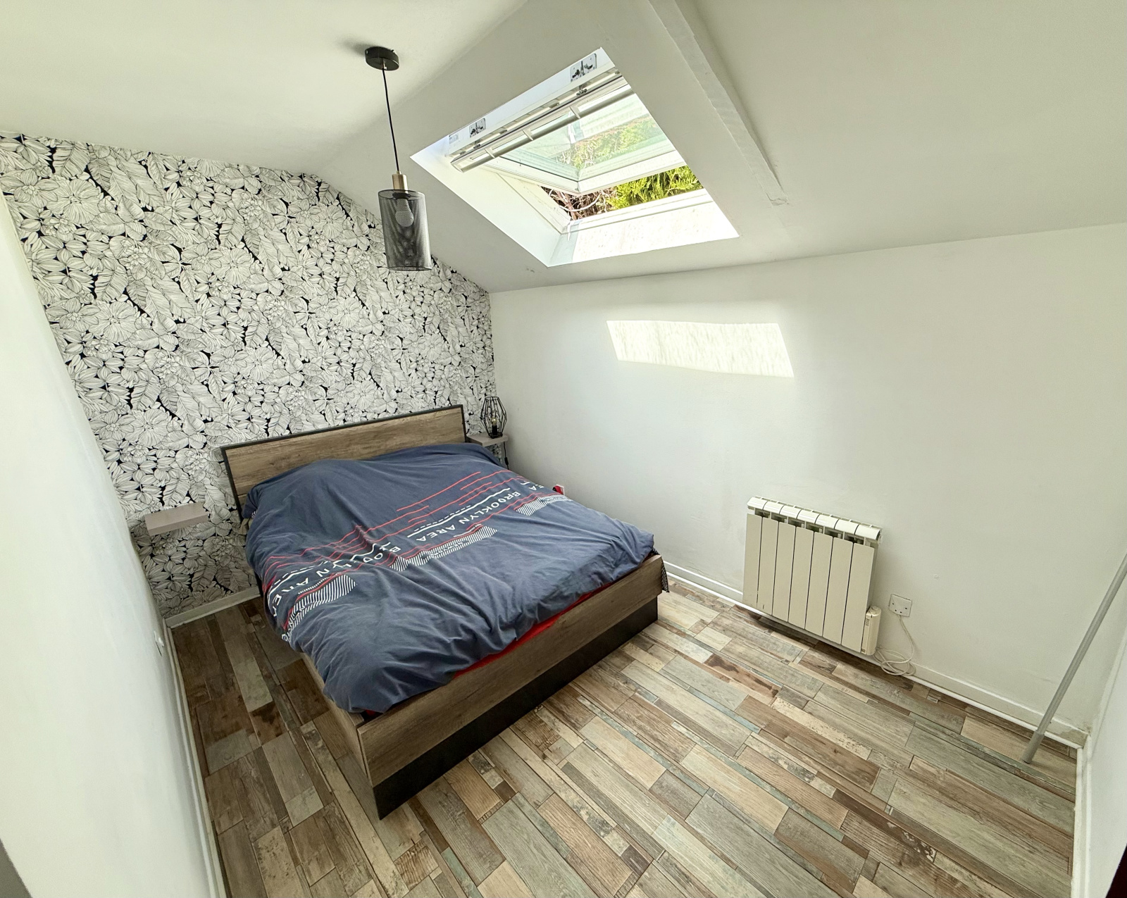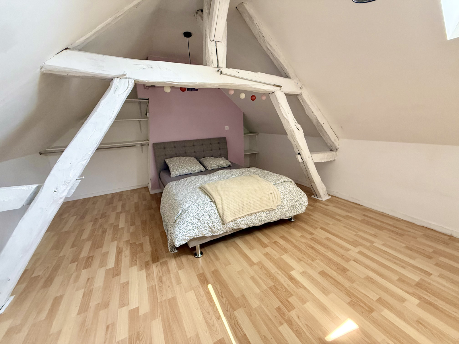 L’escalier, situé dans la pièce principale, mène à l’étage. Le long de cet escalier, des placards intégrés offrent des rangements supplémentaires pratiques. À l’étage, une mezzanine distribue deux belles chambres sous combles : l’une de 19,68 m² et l’autre de 15,99 m² au sol, idéales pour des enfants, un bureau ou une chambre d’amis.