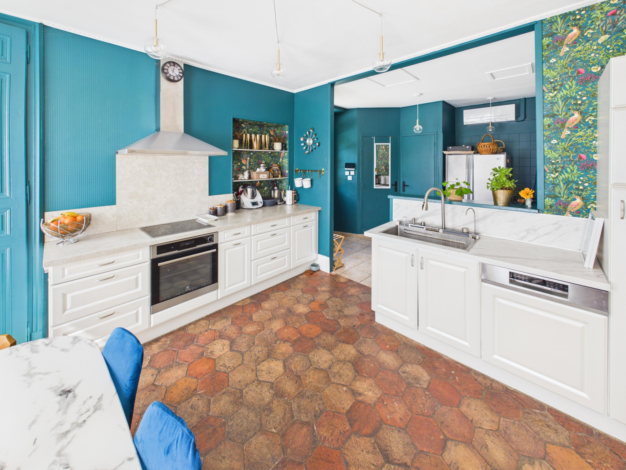 Dès l’entrée, vous serez séduit par de beaux volumes de vie, avec un espace salon chaleureux agrémenté d’une cheminée, idéal pour vos moments en famille. La maison dispose également d’une cuisine indépendante avec tomette au sol, alliant authenticité et fonctionnalité.
