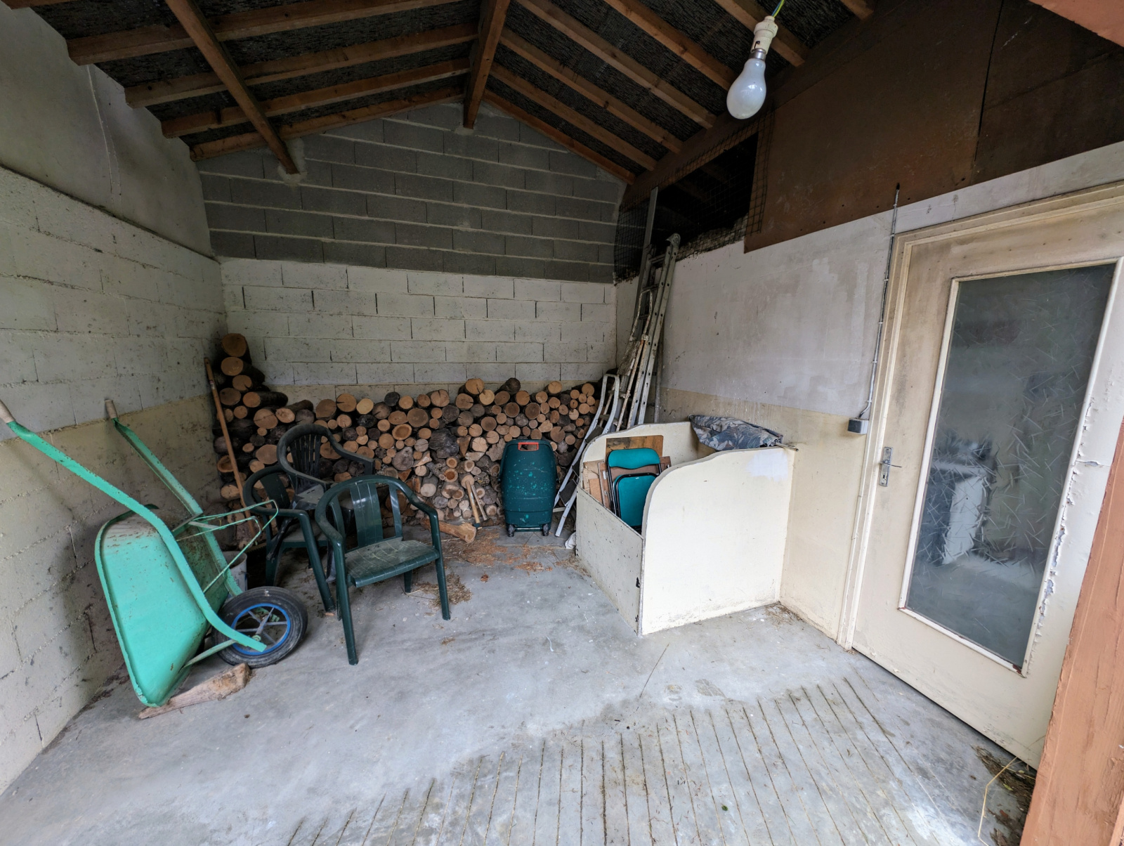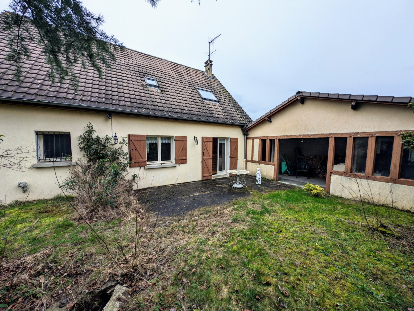 Cette propriété est également dotée d'un garage attenant, d'un bucher extérieur pour le bois de la cheminée, ainsi que d'un espace atelier et de rangement, idéal pour les bricoleurs ou pour ceux ayant besoin de stockage supplémentaire.