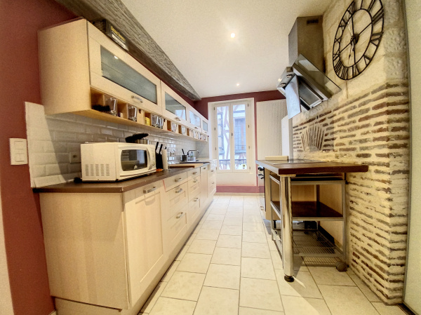 Cet appartement dispose d’un salon lumineux qui offre une vue agréable sur le jardin de la copropriété. La cuisine est entièrement équipée et aménagée, avec un grand placard de rangement intégré, offrant un espace pratique et fonctionnel.